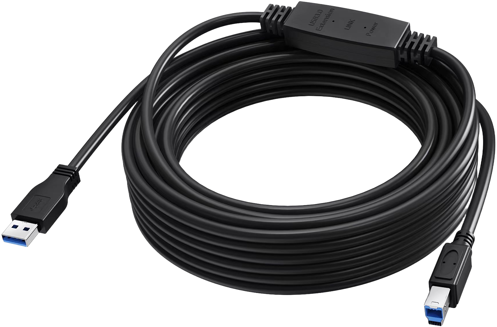 USB-A er den type stik, der tilsluttes din bærbare computer. USB-B er enden, der tilsluttes din printer. Dette kabel har en indbygget aktiv booster halvvejs langs kablet.
