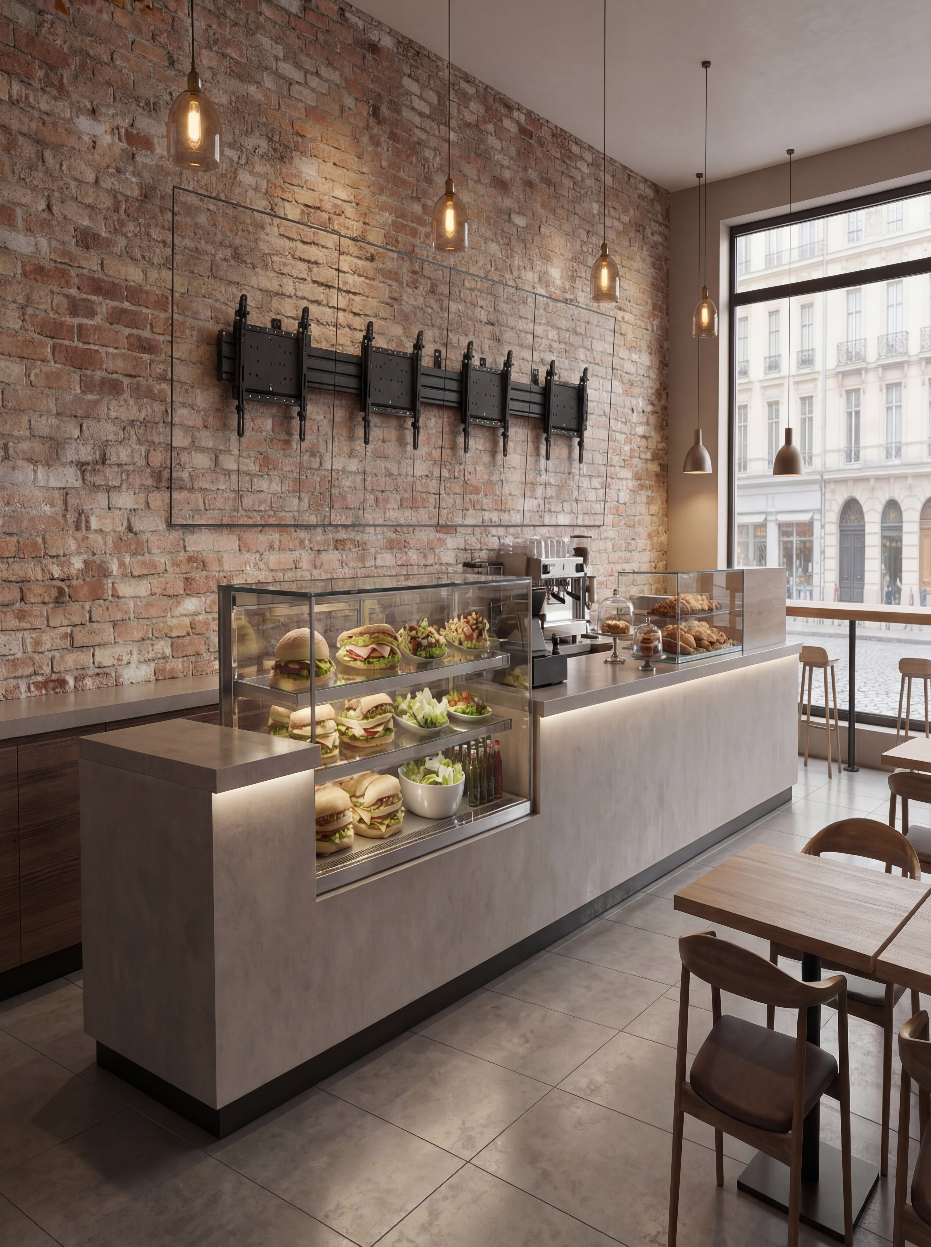 Opsætningen inkluderer en kamerahylde, der kan holde et kamera over, under eller mellem skærmene, hvilket gør det til en bekvem måde at placere sikkerhedsovervågning for salgsområdet.